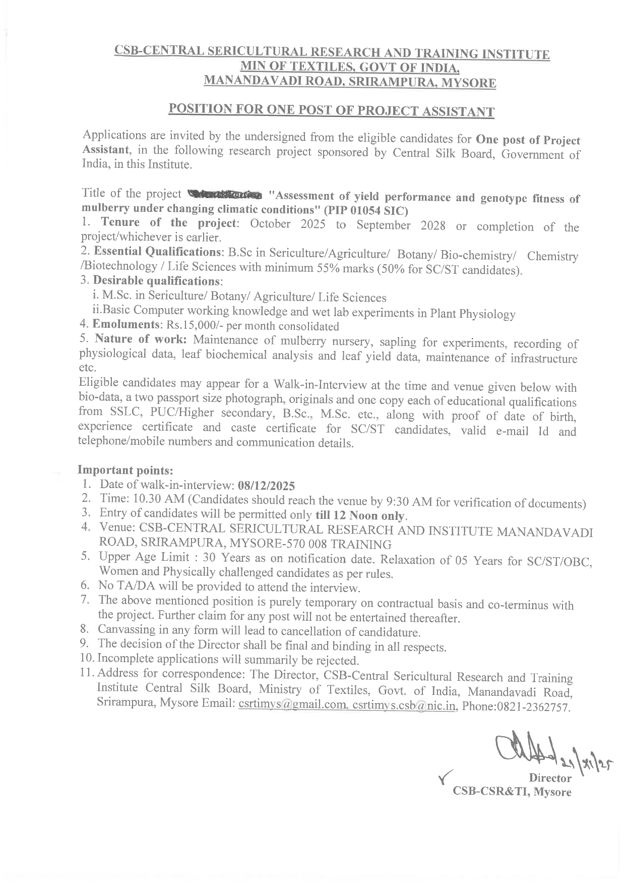 Application for the One post of Project Assistant (PIP 01054 SIC) (Last Date : 08-12-2025)