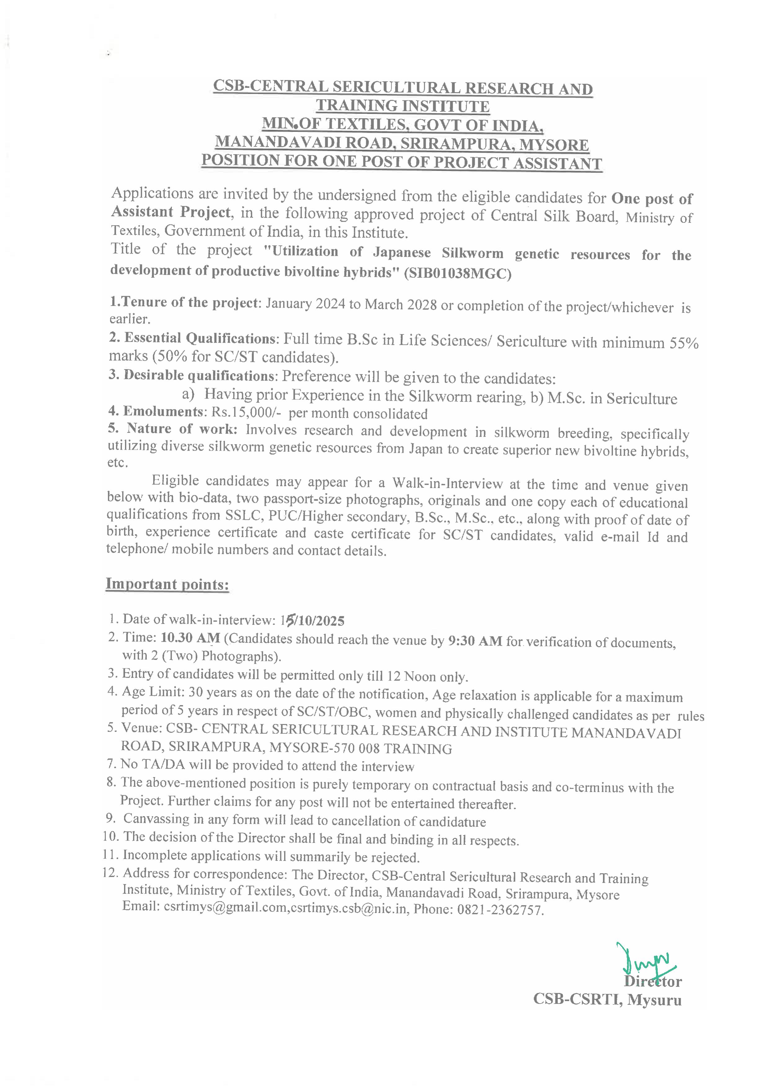 Application for the post of Assistant Project in the project "Utilization of Japanese Silkworm genetic resources for development of productive bivoltine hybrid(SIB01038MGC)"