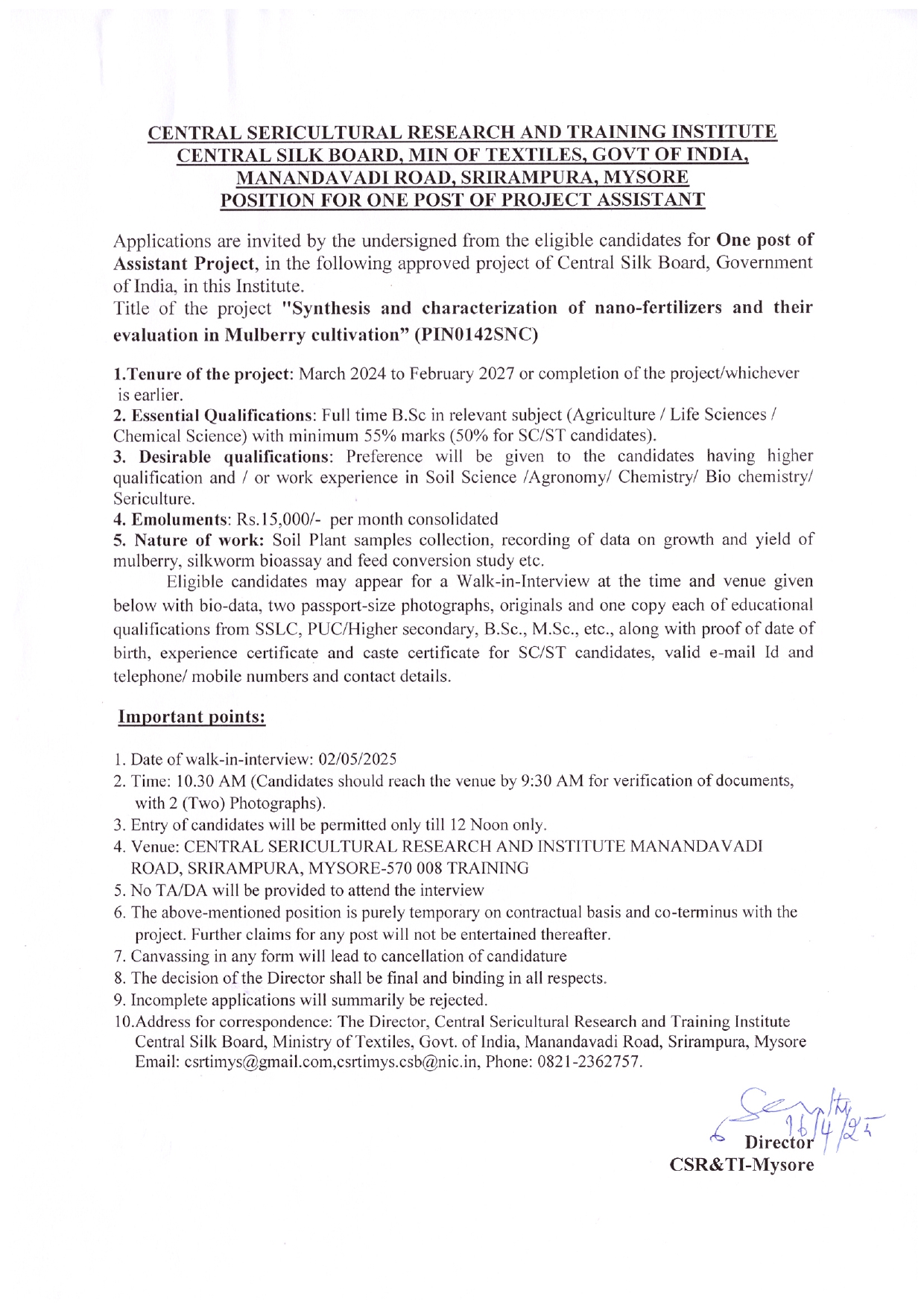 walk-in-Interview for the post of Assistant Project "Synthesis and characterization of nano - fertilizers and their evaluation in mulberry cultivation PIN0142SNC" interview date 02 MAY 2025