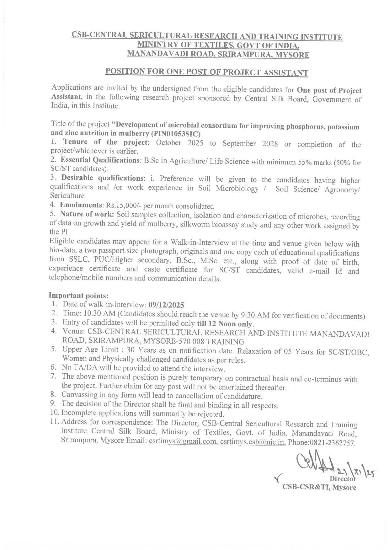Application for the One post of Project Assistant (PIN01053SIC) (Last Date : 09-12-2025)