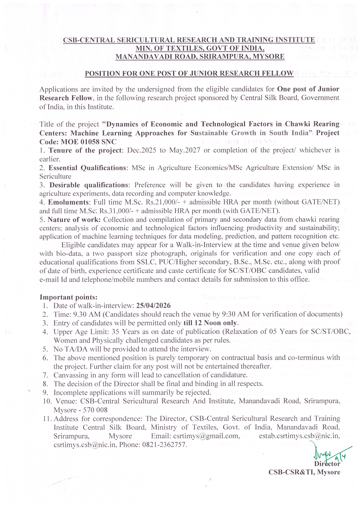 Applications are invited from eligible candidates for One post of Junior Research Fellow (JRF) (Walk-in-interview:25-04-26)