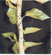 | Occurrence & Symptoms | Scale insect, Saissetia nigra is a minor pest that occurs throughout the year, but severe during summer months.They are found on the underside of leaves and on stem. Both nymphs (crawlers) and adults feed on plant sap by sucking. Feeding causes the plant to become stunted and affected shoots start dying from the distal end. |